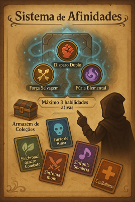 O Sistema de Afinidades permite que o jogador organize habilidades passivas em coleções especiais, ampliando os bônus da conta como um todo. Para mais informações, a referência é: Sistema de Coleção.