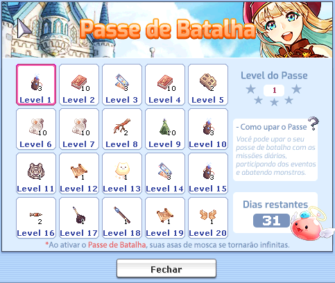 2. No cash shop, você encontrará o item "Passe de Batalha", ele tem o valor de 30k de cash, que por sua vez pode ser adquirido através de uma doação em nosso site ou com outros jogadores.